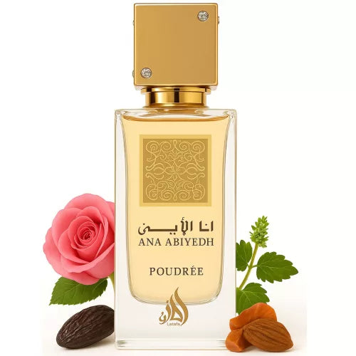 Ana Abiyedh Poudrée se abre con un bouquet suave y luminoso que da paso a un corazón limpio, empolvado y ligeramente floral. Su fondo combina una mezcla elegante de vainilla cremosa, tonka dulce, vetiver, pachulí y un toque de oud que aporta estructura y profundidad sin perder suavidad.