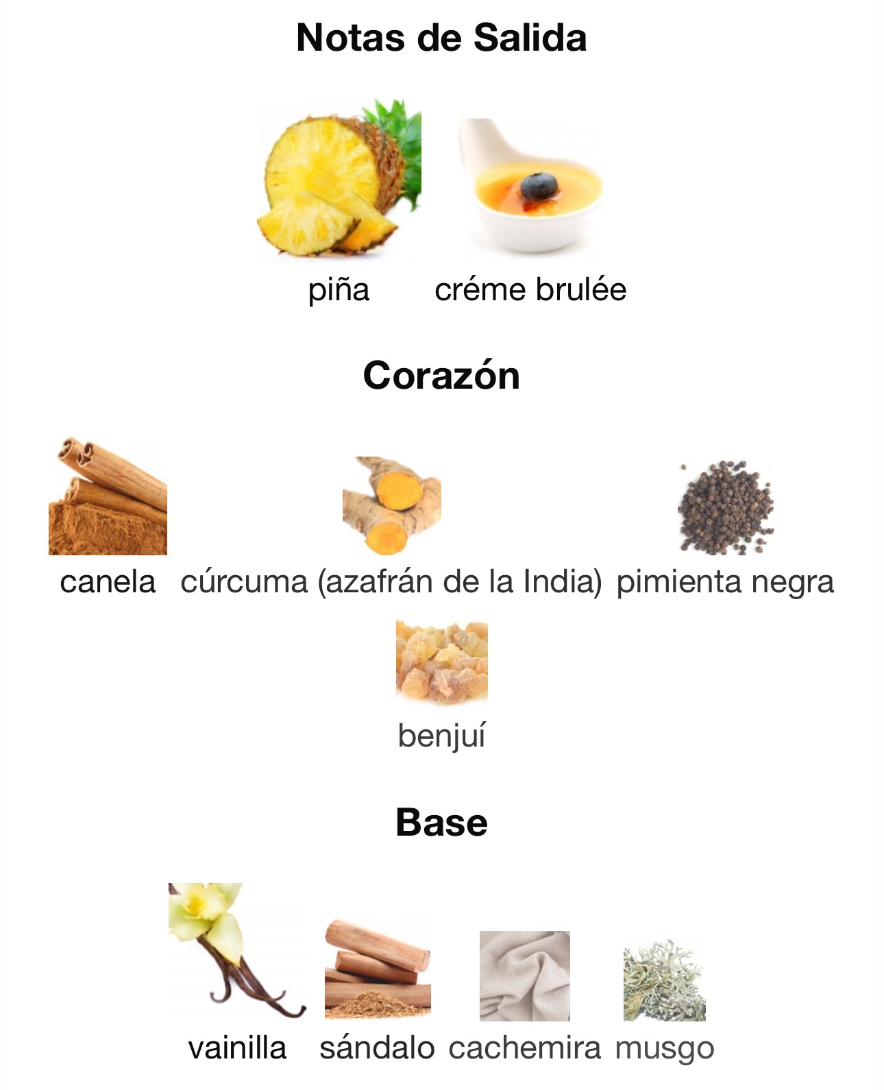 Abre con piña dulce y mirabel, evoluciona hacia un corazón de cacao, leche y vainilla especiada, y se asienta en una base adictiva de tonka y ámbar.