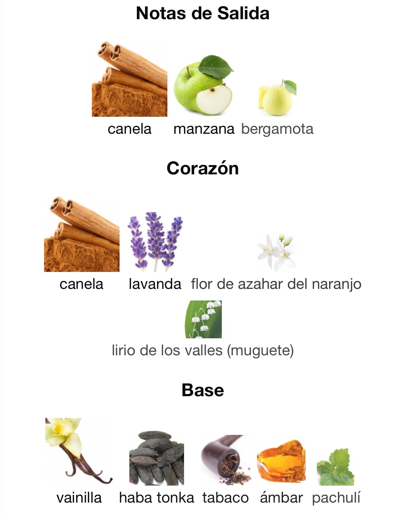 Canela, lavanda, flor de azahar y lirio de los valles (muguet).