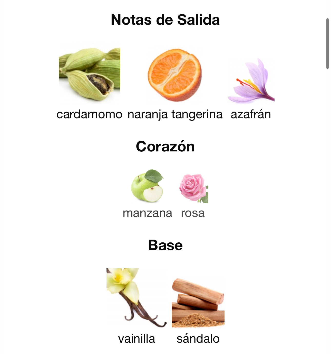 En el corazón, se mezcla la manzana dulce con rosa delicada y notas lechosas que evocan crema pastelera. Finalmente, una base cálida de vainilla y sándalo aporta suavidad, elegancia y un toque gourmand duradero.